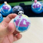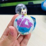 Five spherical 2x2x2s, each depicting a stylized world map with five different pandas as keychain attachments. magic ball cubes