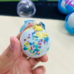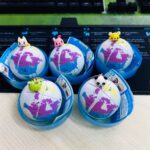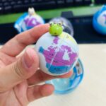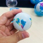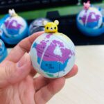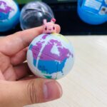 Five spherical 2x2x2s, each depicting a stylized world map with five different pandas as keychain attachments.